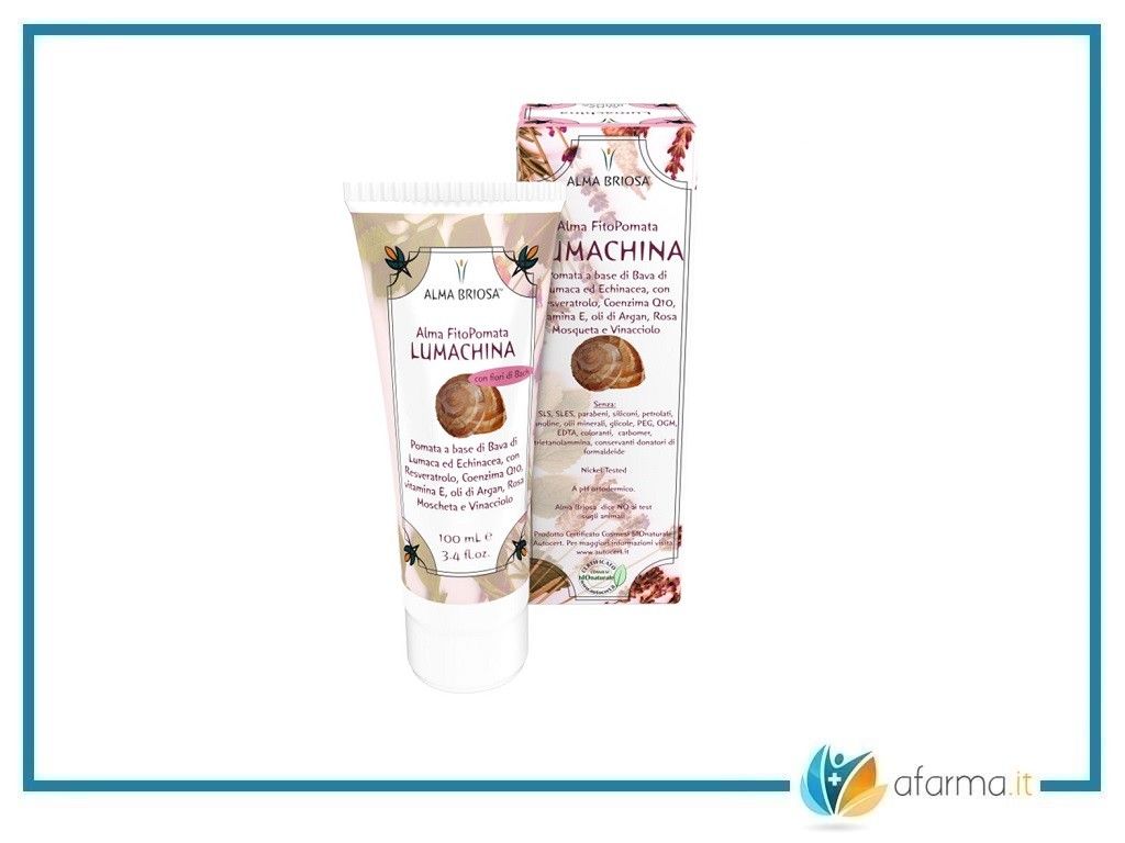 Alma Briosa Fitopomata Lumachina è la pomata ideata per combattere gli inestetismi cutanei (cicatrici, rughe, smagliature, danni da acne e brufoli) grazie alle proprietà rigeneranti della Bava di Lumaca che aiutano la ricostruzione dei tessuti danneggiati.