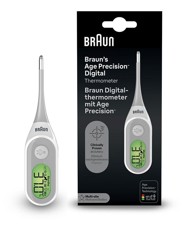 Grazie all'algoritmo del suo processore, il termometro Braun ti aiuta a interpretare correttamente i risultati utilizzando anche una scala colori oltre alla differenziazione per età (0-3 mesi, 3-36 mesi, 36+ mesi):