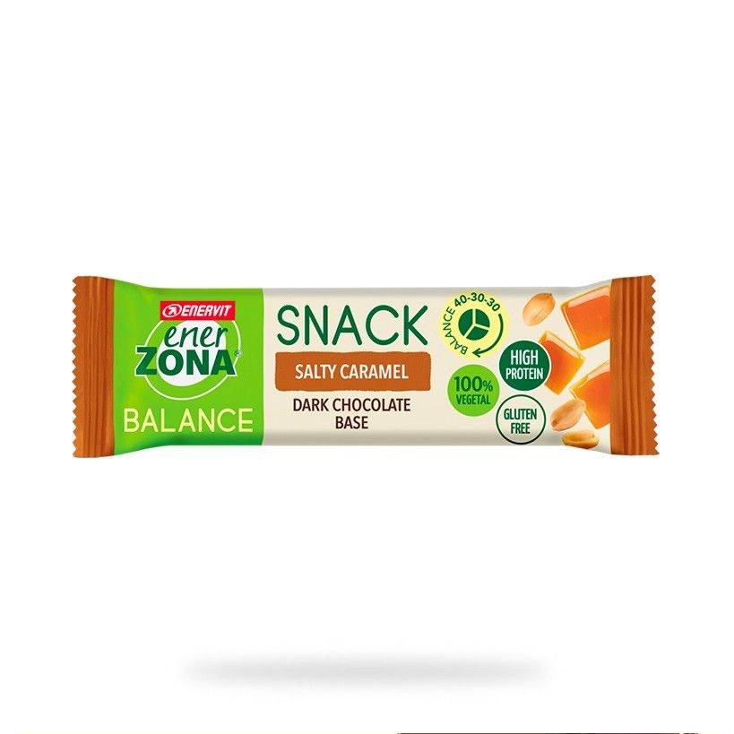 Barretta al caramello salato e arachidi, con base di cioccolato fondente. Ricetta bilanciata 40-30-30. Senza glutine.