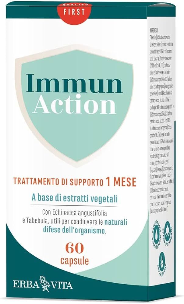 Immun Action Erba Vita è un Integratore alimentare ad esclusiva base vegetale caratterizzato dalla presenza di piante officinali selezionate: contiene echinacea, tabebuia ed andrographis, che coadiuvano che sostengono le naturali difese dell'organismo. Può essere assunto anche per periodi prolungati.