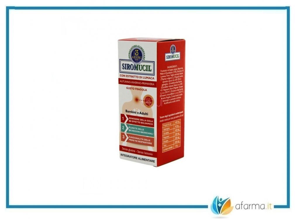 SiromucilSciroppo, 3 azioni con estratto di lumaca, al gusto fragola. Contrasta in modo efficace i tre principali malanni stagionali della gola; bruciore di gola e irritazione, tosse secca e tosse grassa; coadiuvante per il benessere della gola e delle vie respiratorie.
