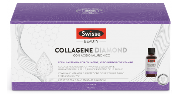 Swisse Collagene Diamond è un Integratore alimentare a base di collagene, acido ialuronico, vitamine e minerali, utile per favorire elasticità e luminosità alla pelle e ridurre l’aspetto delle rughe, contribuire alla protezione delle cellule dallo stress ossidativo, contribuire alla normale formazione del collagene per la normale funzione della pelle. Contiene estratto di semi d'uva (avente antiossidanti ).